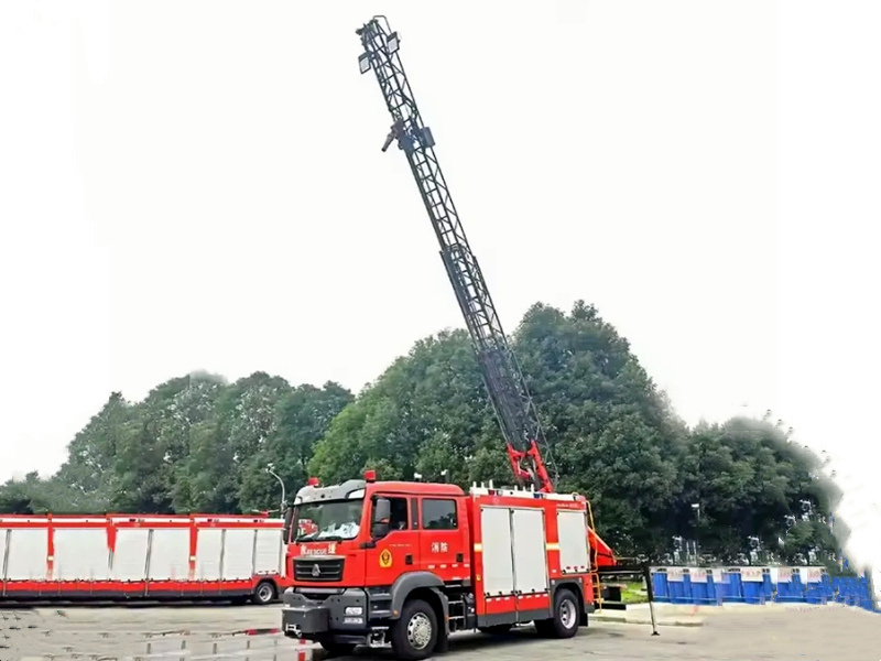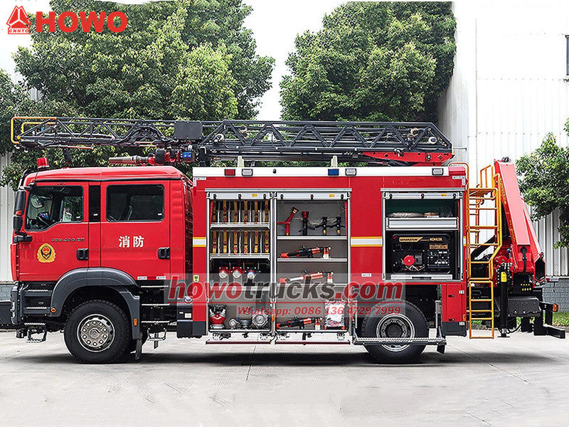 ---Das Howo Fire Rescue-Fahrzeug kann gleichzeitig Höhenrettung, das Heben schwerer Gegenstände und die Brandbekämpfung durchführen.;