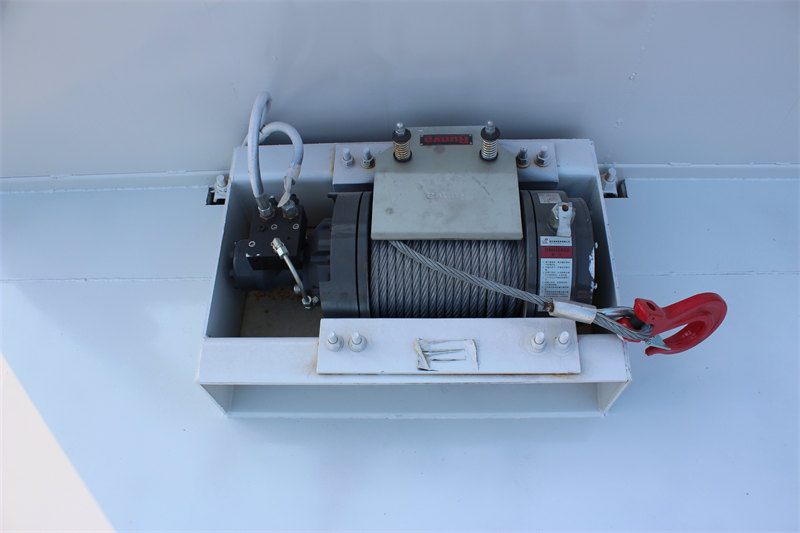 4. Effizientes Selbstbe- und -entladen: Ausgestattet mit einer 8-Tonnen-Hydraulikwinde, einer 2 Meter langen Hydraulikrampe und einem 25 Tonnen schweren vorderen Hydraulikstützbein, ermöglicht dies das unabhängige Be- und Entladen von Ausrüstung ohne den Einsatz zusätzlicher Maschinen.