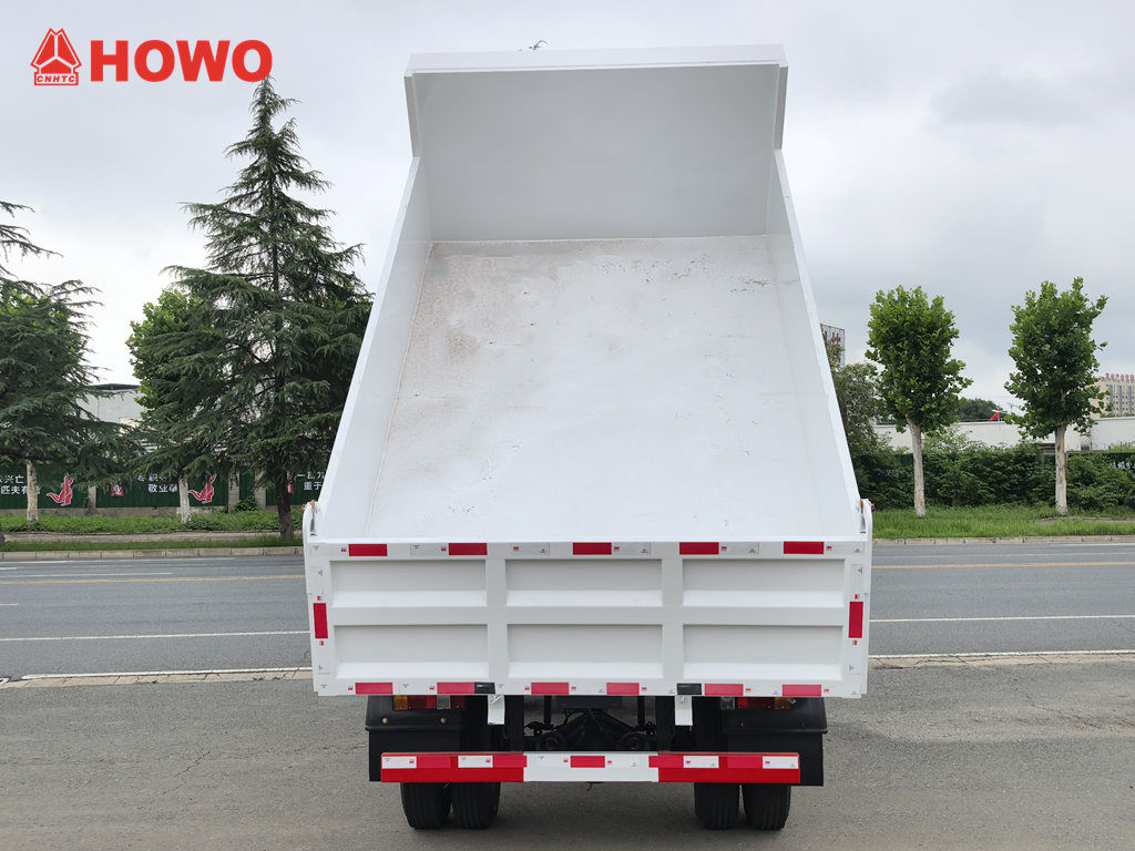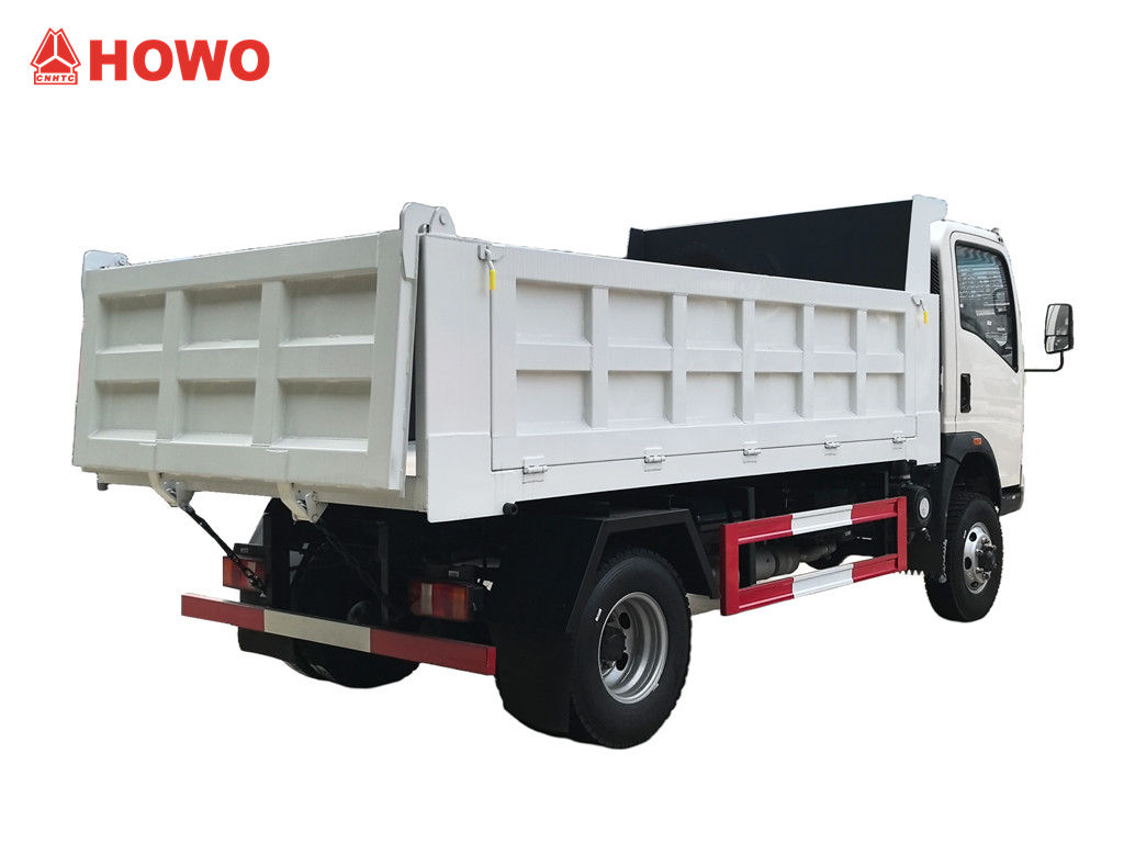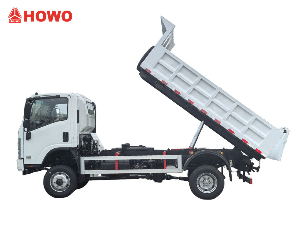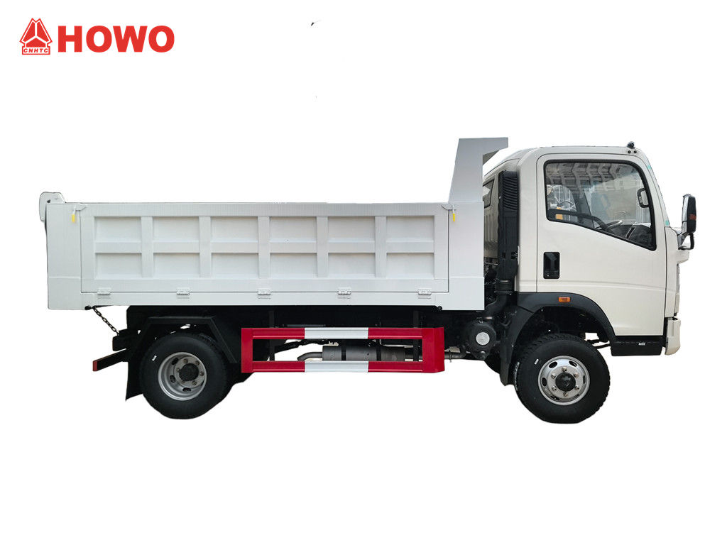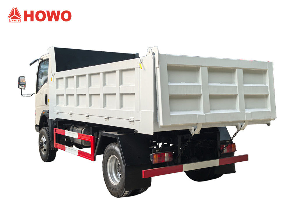 Der Howo 3-Tonnen-Gelände-Minidumper basiert auf dem HOWO-Leicht-Lkw-4x4-RHD-Chassis mit einem Radstand von 3360 mm und ist mit einem 116 PS starken YN4102QBZL-Dieselmotor, einem WLY6TS55C-6-Gang-Getriebe und einer Mulde aus Kohlenstoffstahl mit drei Seitenwänden und vier Böden (3550 × 2100 × 550 mm) ausgestattet. Er verfügt über eine zentrale Hebevorrichtung, die ein stabiles Anheben, ein sauberes und schnelles Entladen ermöglicht. Die Hecktüren lassen sich öffnen, und das Fahrzeug wird über ein Steuerventil auf der Fahrerseite gesteuert, was die Bedienung vereinfacht.