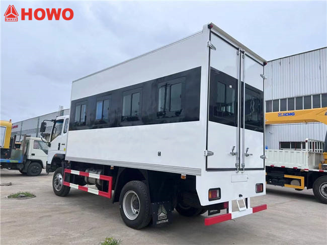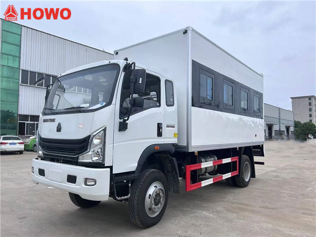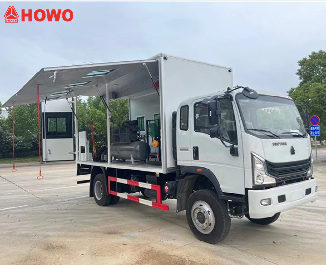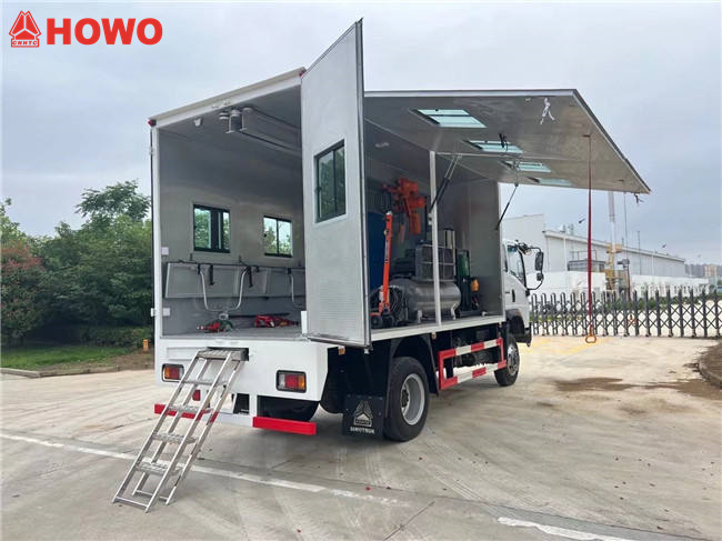Das mobile Wartungsfahrzeug HOWO 4x4 verfügt über folgende Konfigurationen: HOWO 1880 Einzelkabine, 3360 mm Radstand, Weichai WP3NQ140E50 Motor, WLY6G120 Getriebe, Kastenaufbau mit den Maßen 4200 x 2100 x 2000 mm, rechte Seitenwand mit Flügelspannweite und Teleskopstütze, Fenster, Bodenplatte aus Aluminiumlegierung, Innenbeleuchtung und Wartungsausrüstung inklusive Luftkompressor, Generator, maßgefertigten Regalen, hydraulischem Klapparmkran, Werkzeugschrank und Betankungsanlage.Maschine mit Betankungsdüse und 10 Meter langer Ölschlauchhaspel, Leiter, Sauerstoffflaschen, Acetylenflaschen, Gasschneid- und Hydraulikschweißgeräte, eineHandschleifer, zwei Feuerlöscher usw.