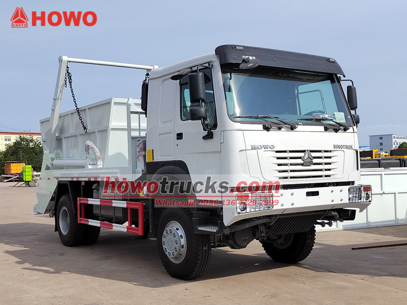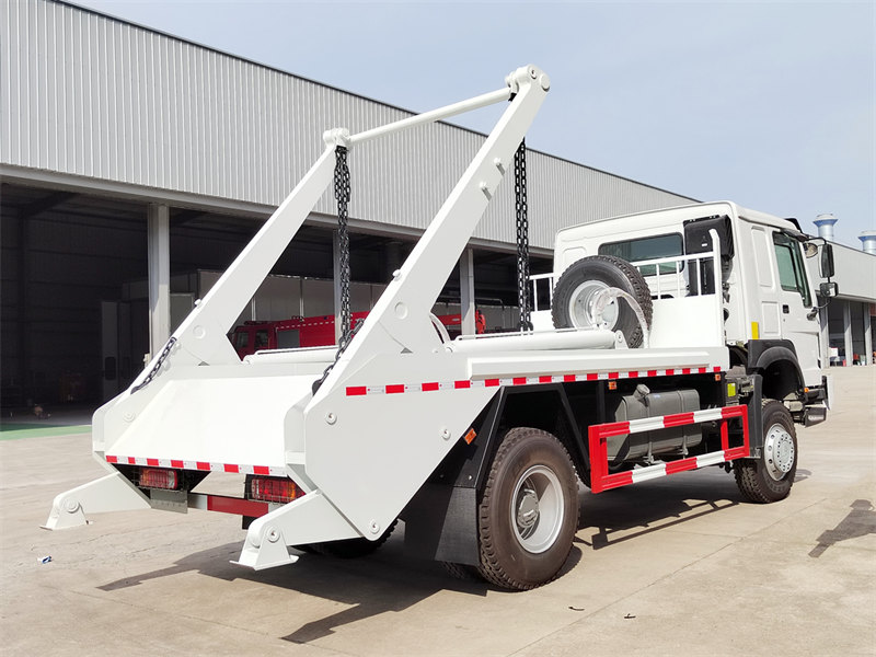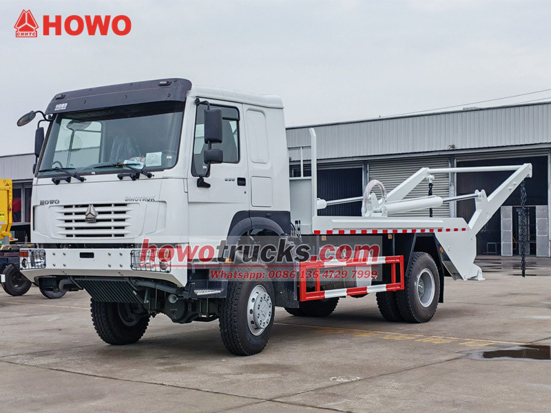 10000Der HOWO 4×4 Abrollkipper ist ein Spezialfahrzeug für die Abfallentsorgung. Er nutzt ein Hydrauliksystem zum Antrieb eines Schwenkarms für das maschinelle Be- und Entladen von Abfallcontainern. Das Fahrzeug basiert auf einem HOWO 4×4 Allrad-Fahrgestell mit einem 266 PS starken Sinotruk-Motor und ist mit einem HOWO 10-Gang-Getriebe sowie hochfesten Achsen ausgestattet. Dies gewährleistet hohe Tragfähigkeit und Zuverlässigkeit auch unter schweren Lasten und anspruchsvollen Straßenverhältnissen. Der Aufbau besteht aus hochfestem Stahl und sorgt für Robustheit und Langlebigkeit. Das hydraulische Schwenkarmsystem arbeitet leichtgängig und kraftvoll und hat eine Hubkraft von über 6 Tonnen. Jeder Arbeitszyklus dauert weniger als eine Minute, was hohe Effizienz und Zeitersparnis garantiert.