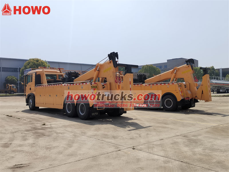 Der Howo 6x4 Abschleppwagen ist mit einem robusten hydraulischen Stützsystem (Tragfähigkeit 12,5 Tonnen pro Stütze) ausgestattet, das eine große Stützweite bietet und Sicherheit und Stabilität bei anspruchsvollen Rettungseinsätzen gewährleistet. Die gelbe, luxuriöse 1,5-Sitzer-Schlafkabine (weitere Farben erhältlich), der 400-Liter-Kraftstofftank, das 24-V-Bordnetz, die komplette Warnbeleuchtung (Warnleuchten, Blitzleuchten), der Werkzeugkasten und weiteres Zubehör machen ihn zu einem professionellen Abschlepp- und Rettungsfahrzeug mit umfassenden Funktionen und hoher Leistung.