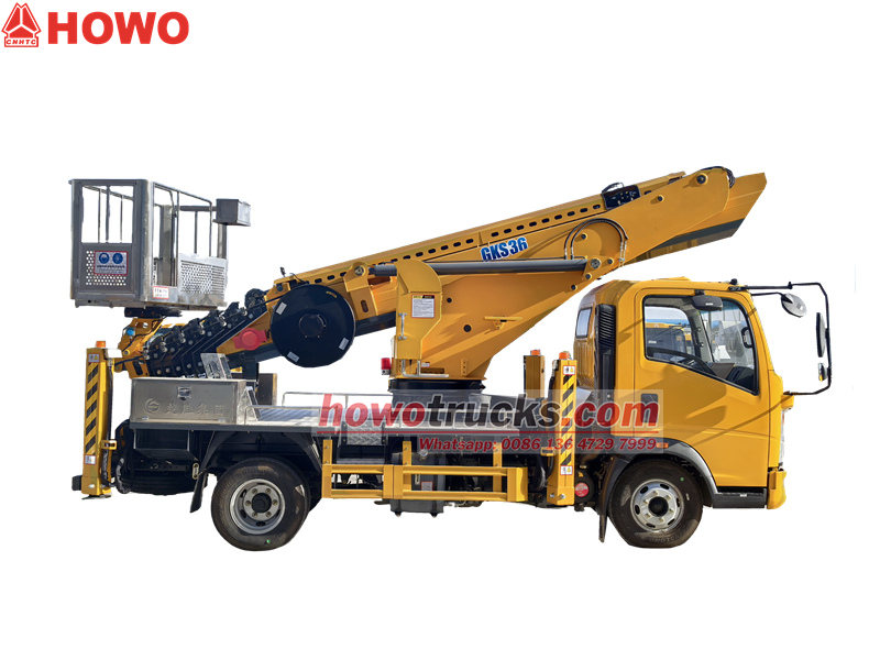 Die einzigartige H-förmige hydraulische Stützkonstruktion mit Zweiwege-Hydraulikverriegelung gewährleistet Stabilität im Betrieb. Der Howo-Arbeitsbühnenwagen verfügt zudem über ein duales Bediensystem mit manueller und drahtloser Fernbedienung, eine Plattformtragfähigkeit von 200 kg, 360°-Hydraulikdrehung und integrierte Sicherheitsvorrichtungen wie automatische Bereichsbegrenzung, Not-Aus-Funktion und Leckageschutz.