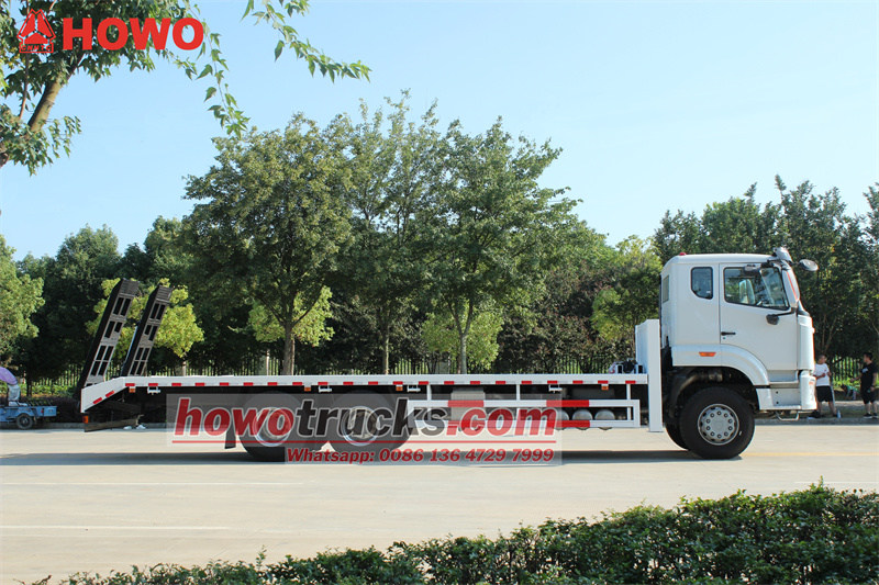 18000(2 axles)Der HOWO NX 20 Tonnen Selbstlader Dieses Spezialfahrzeug ist für den Transport schwerer Ausrüstung konzipiert. Ausgestattet mit einem speziellen Aufbau und einem hydraulischen Steuerungssystem ermöglicht es schnelles Be- und Entladen sowie effizienten Transport. Angetrieben von einem 400 PS starken Weichai-Motor und einem 10-Gang-Getriebe von Sinotruk, bietet es kraftvolle und zuverlässige Leistung. Der Aufbau besteht aus einer robusten, 7,5 Meter langen und 8 mm dicken Riffelblechkonstruktion und gewährleistet eine außergewöhnliche Tragfähigkeit. Zu den wichtigsten Merkmalen gehören eine 45 Meter lange und 20 Tonnen tragende Seilwinde, hydraulische Stützen vorne und eine 2,2 Meter lange mechanische Federrampe hinten. Die hinteren hydraulischen Stützen werden zentral vom Heck des Fahrzeugs aus gesteuert, was eine hohe Betriebseffizienz sicherstellt.