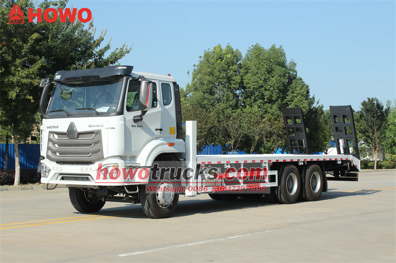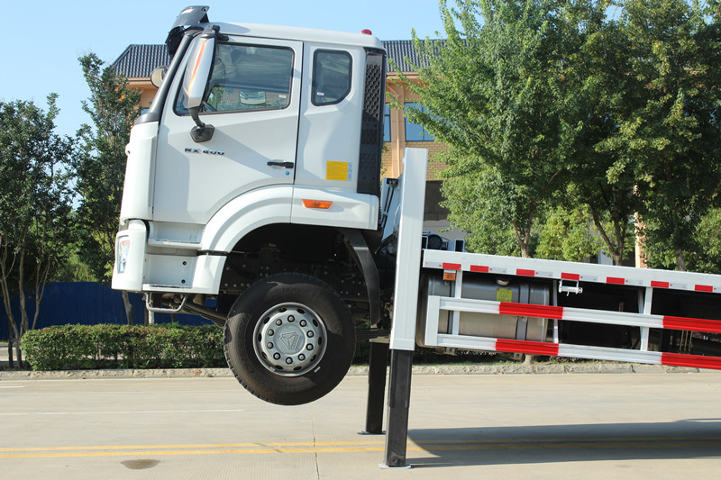 Der HOWO NX 20-Tonnen-Selbstlader ist ein Pritschenwagen, der auf dem HOWO NX400 6x4-Fahrgestell basiert. Er ist mit einem Weichai WP12.400E201-Motor und einem Sinotruk HW19710-Getriebe ausgestattet. Die Ladefläche misst 7,5 x 2,5 Meter und besteht aus 8 mm dickem, rutschfestem Profilblech. Der Unterboden ist aus 120 x 120 x 5 mm starkem Vierkantstahl gefertigt. Am Heck befindet sich eine 2,2 Meter lange, mechanische, federnde Ganzstahlrampe mit zusätzlichen Stützen. Die Frontpartie ist mit hydraulischen Stützen und einer 45 Meter langen 20-Tonnen-Winde ausgestattet. Die Bedienhebel links und rechts am Heck steuern die hydraulischen Stützen, die Winde, die mechanische Rampe usw.