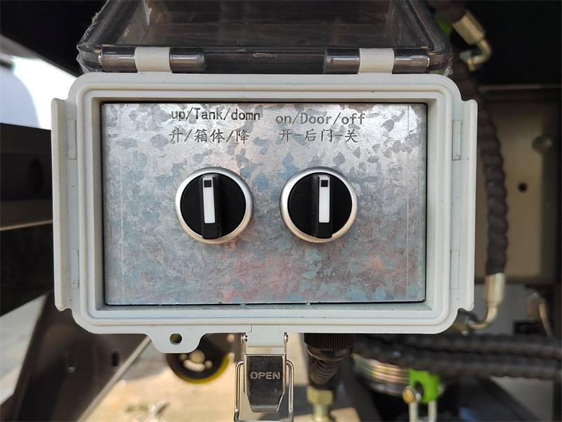 Die hintere Tür des Tanks ist mit einem hydraulischen Stiftverriegelungsmechanismus ausgestattet. Dieses System ermöglicht das automatische Öffnen, Schließen und Verriegeln der Tür per Knopfdruck und gewährleistet so eine sichere Abdichtung, um das Austreten von Abfall und Abwasser wirksam zu verhindern.