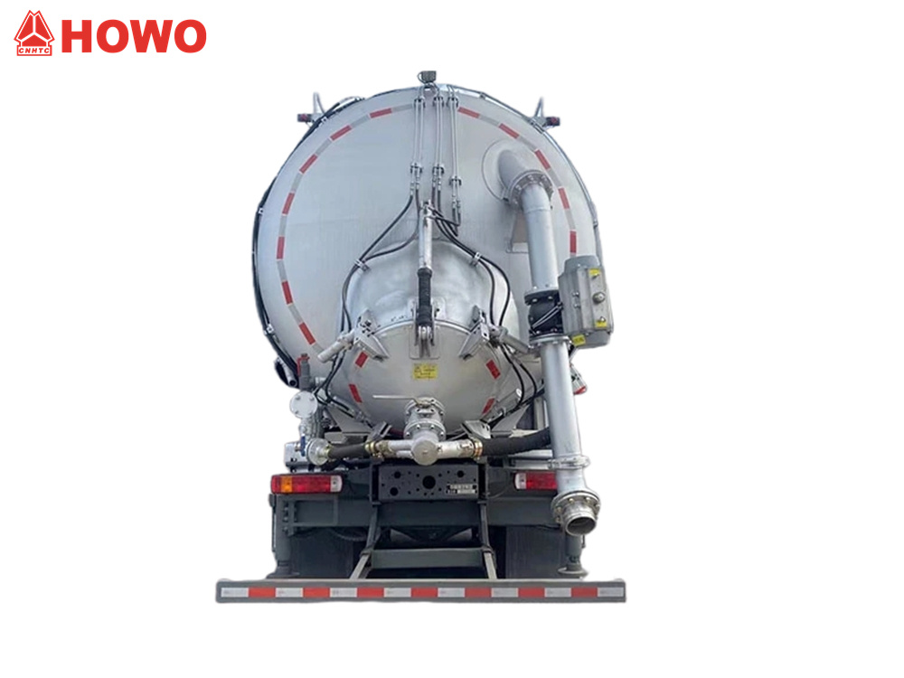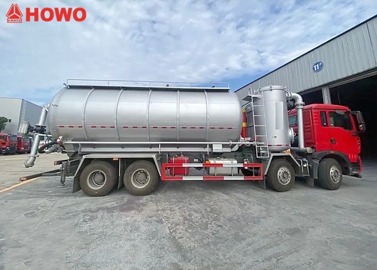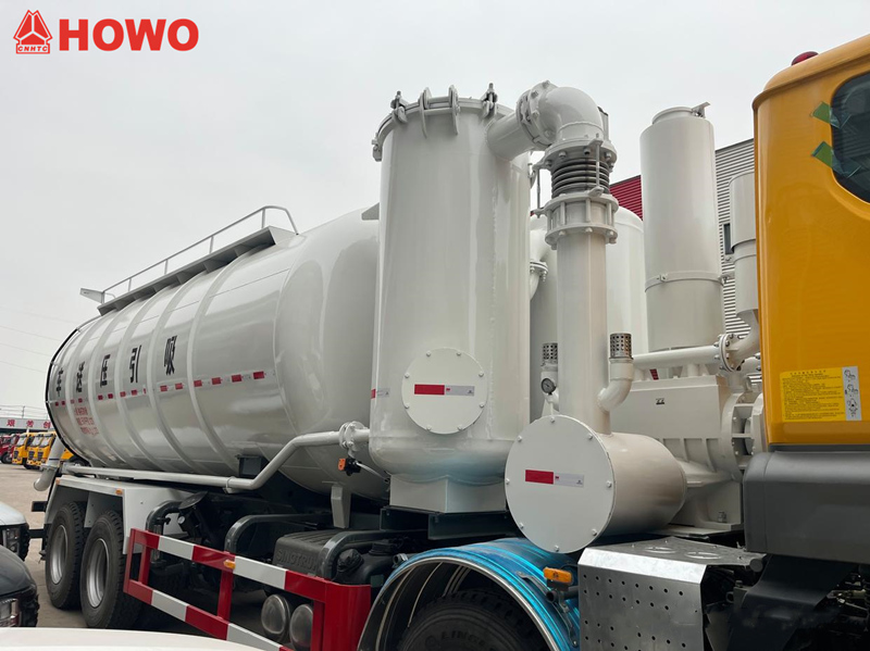 HOWO 8x4 25 m³ Saug- und Druckförderer, modifiziert auf dem HOWO TX350 8x4 Fahrgestell, mit einem großen Radstand von 1800+4600+1350 mm, ausgestattet mit einem Sinotruk MC07H.35-60 Motor und einem HW15710L Getriebe. Der Aufbau ist komplett mit Schlauchfiltern ausgestattet, das Heck dient als Stautank. Zur Ausstattung gehören hydraulische Stützen, Lüfter, externe Luftansaugrohre, Vakuumpumpen, Luftkompressoren, Hubzylinder, Filtersysteme, Saug- und Druckleitungen, elektronische Steuereinheiten usw. Die Vakuumpumpe arbeitet mit Unterdruck, der Luftkompressor mit Überdruck.
