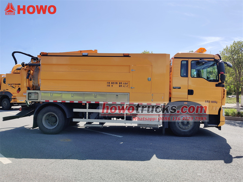 Der HOWO 4x2 11 m³ Kombi-Baggerwagen basiert auf dem HOWO TX 2280 Halbkabinen-Fahrgestell. Er hat einen Radstand von 4500 mm und ist mit einem Sinotruk MC07.31-60 Motor und einem 6-Gang-Getriebe ausgestattet. Er verfügt über einen 6,7 m³ Fäkalientank und einen 4,2 m³ Frischwassertank aus 5 mm dickem Kohlenstoffstahl. An beiden Seiten des Tankaufbaus befinden sich Werkzeugkästen. Eine Seite ist mit einem Steuerkasten, einer Heckklappentrommel, einem Auslassventil, einer Leiter, einem Schauglas usw. ausgestattet. Zur weiteren Ausstattung gehören eine Jurop PVT400 Vakuumpumpe und eine 3N2-SZ Hochdruckreinigungspumpe.