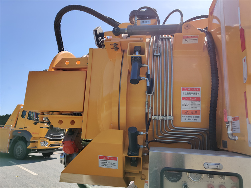 1. Vakuumsaugsystem: Eine Jurop PVT400 Vakuumpumpe erzeugt Unterdruck, der über einen Saugarm in einen 6,7 Kubikmeter fassenden Kohlenstoffstahlbehälter gesaugt wird. Ein Überlaufventil am Behälterdeckel löst automatisch einen Überlaufalarm aus und verschließt den Sauganschluss, um einen Rückfluss zu verhindern. Der Saugarm ist hydraulisch verstellbar und kann angehoben, eingefahren und gedreht werden, um verschiedene Betriebspositionen zu ermöglichen.